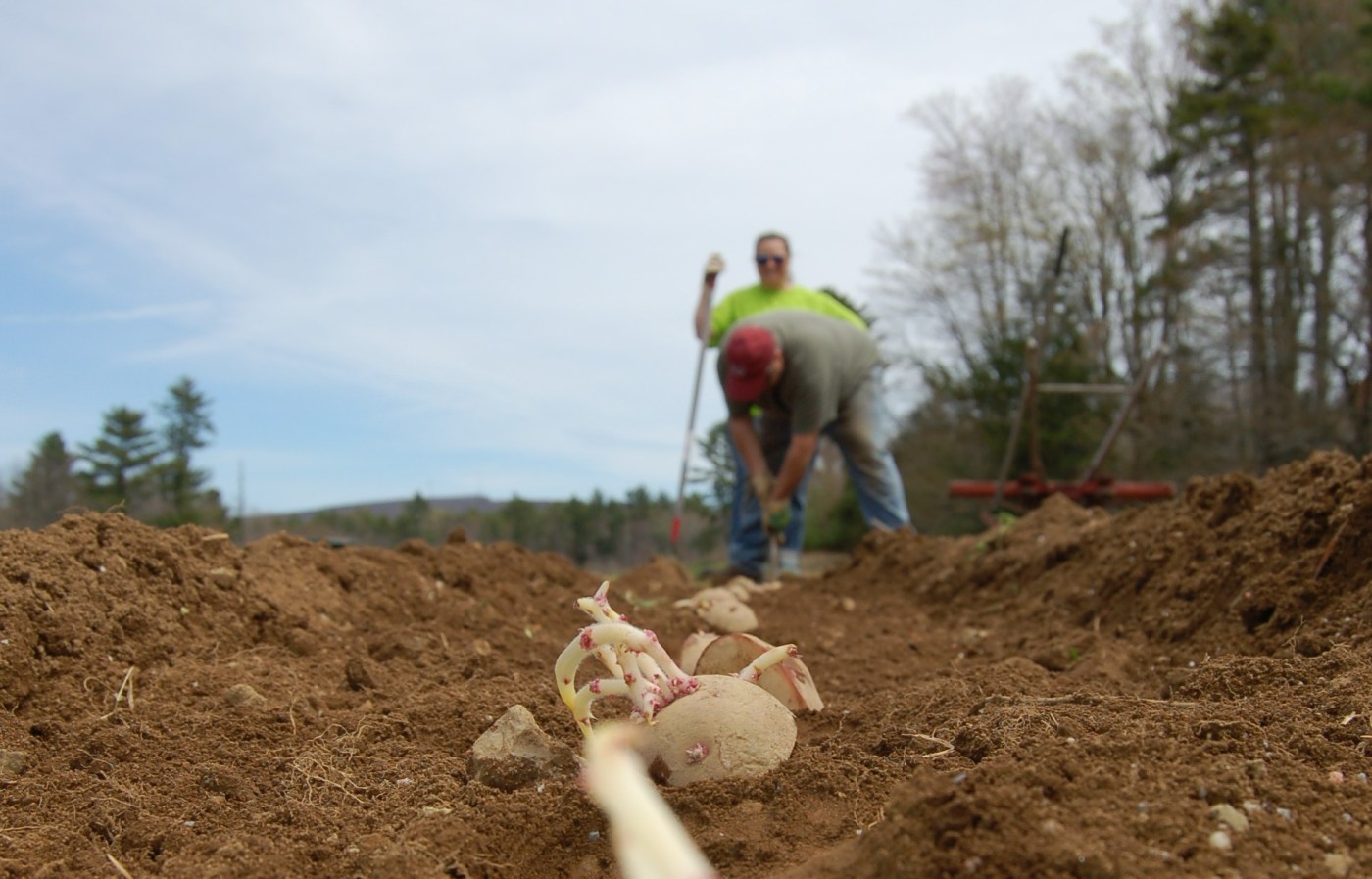 Today, we managed to get in our early potatoes, the ol’ standby Dark Red Norlands, as well as a new variety called Caribou that was developed at the University of Maine. Pretty cool. As mentioned earlier, we still have several varieties left to plant, but the plan is to do that after we figure out a more efficient way to create straight rows.